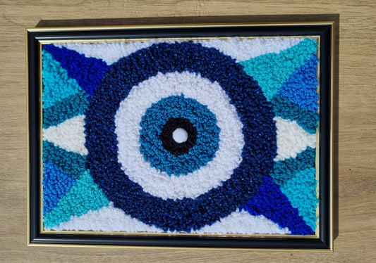 Cadre décoratif punch needle œil turc (nazar) bleu & blanc – pièce unique, 23x33 cm