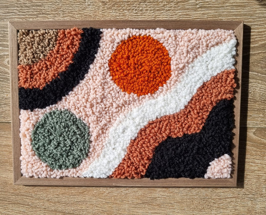Tableau mural en laine punch needle ou tufting, tons chauds beige, marron, orange. Pièce unique, 23x31 cm