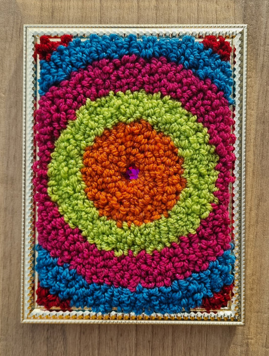 Cadre déco en punch needle / tufting, laine tons multicolores. Strass au centre, 15x20 cm